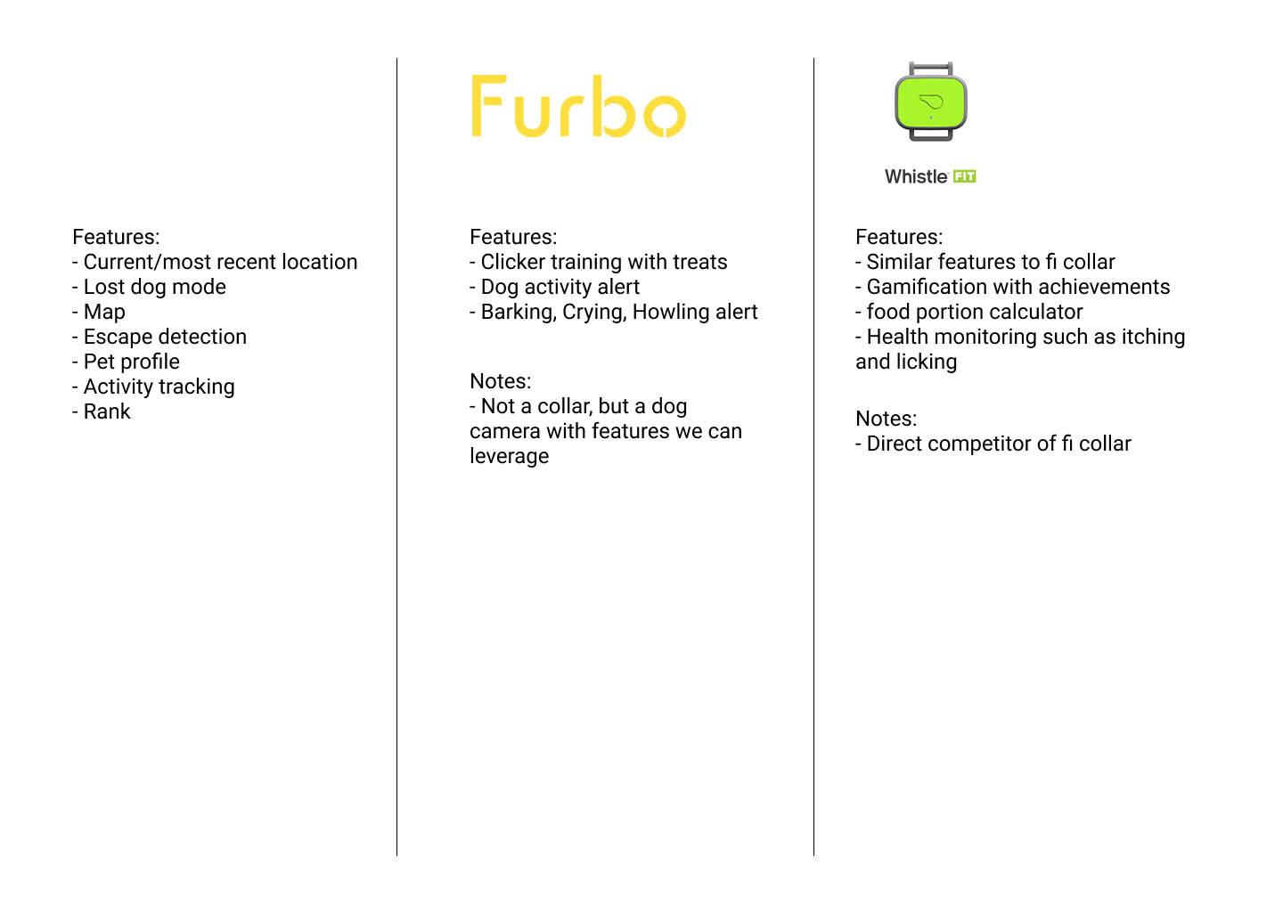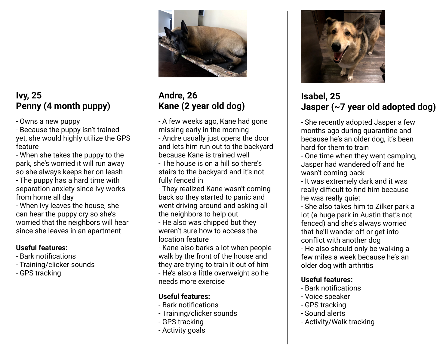 For our next bout of research, we performed user interviews on some dog owners that we knew. They talked about stories about training their dogs, stories where their dogs had run off, and features that they thought would be useful in a smart dog collar. This gave us real life scenarios of potential users and what we could do to help. From the competitive analysis and the user interviews, we wanted to focus on: