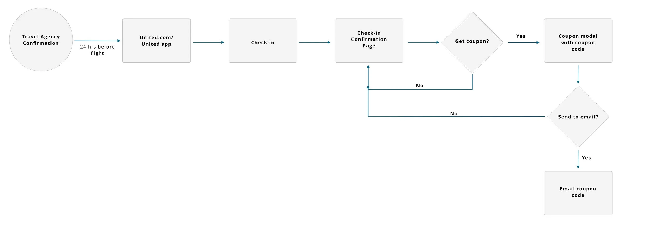 Because about 80% of our users were utilizing the United app and United.com for check-in, I recommended that we focus on this path forward to target these customers with coupons that they are able to use only on United channels. After discussing with the business team and developers, we all agreed that the check-in would be the most beneficial location and possible to get rolled out in the next 60 days. I created a user flow for our MVP flow where we were only targeting users who booked on a travel agency and did not need to sign up for a MileagPlus account to get the coupon code.