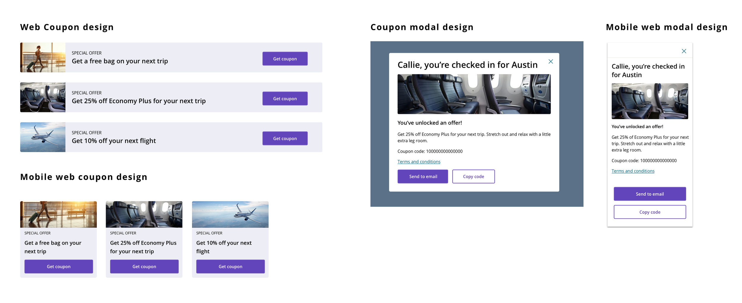 I then explored in low fidelity the different concepts of how we could present the coupon to our users at these entry points so that they were more likely to see it and redeem it on their next flight.