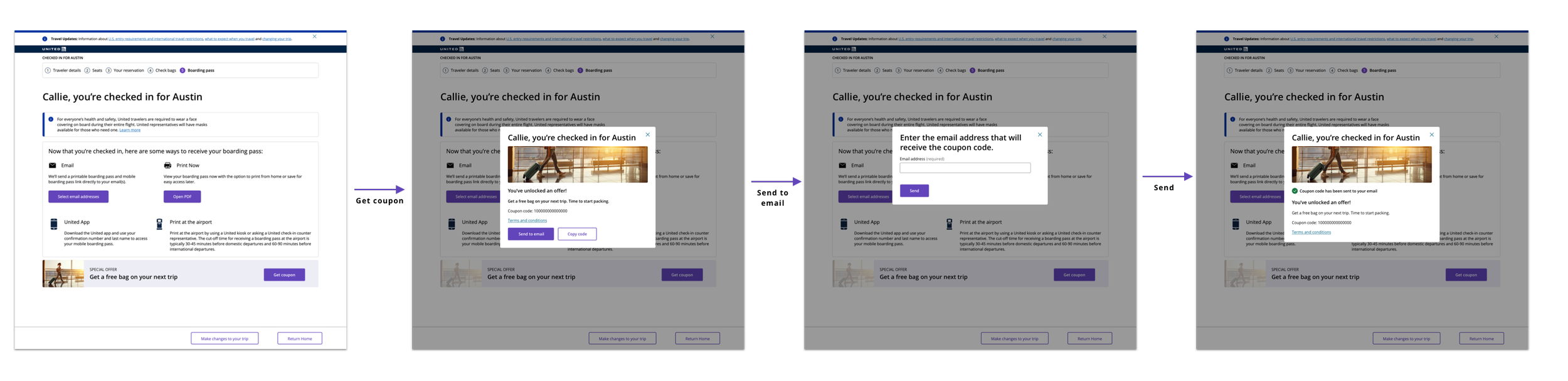 For next steps, I have currently designed a more elaborate flow of requiring the users to sign up for a MilagePlus account in order to get the coupon code. This was a business decision that was made in order to increase account sign ups. We wanted the user to be able to sign up in the easiest way possible so we are working towards including a 1-click enrollment for this process.