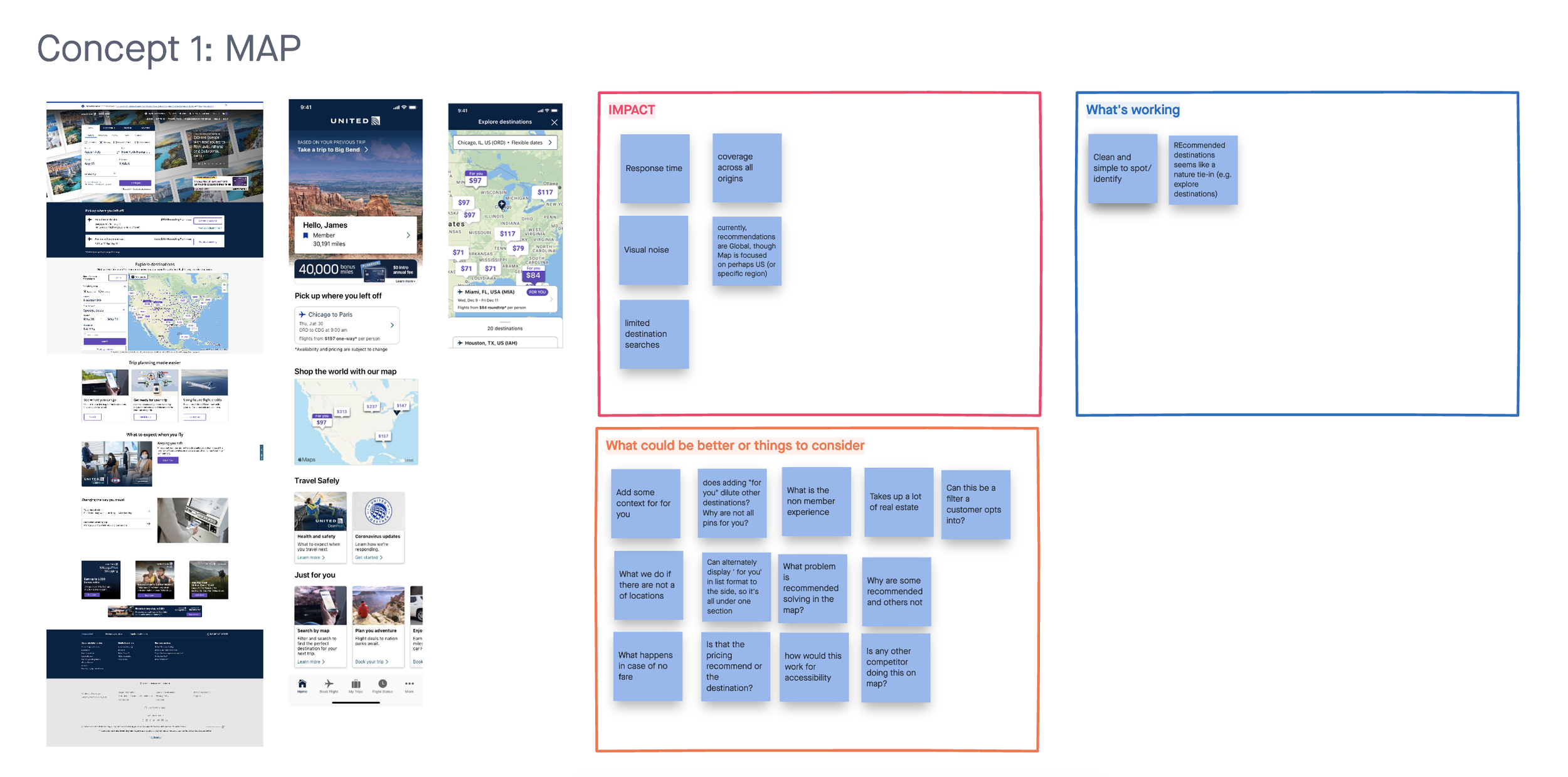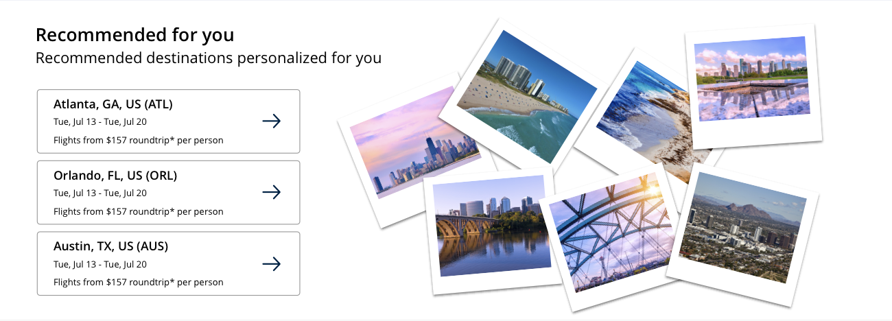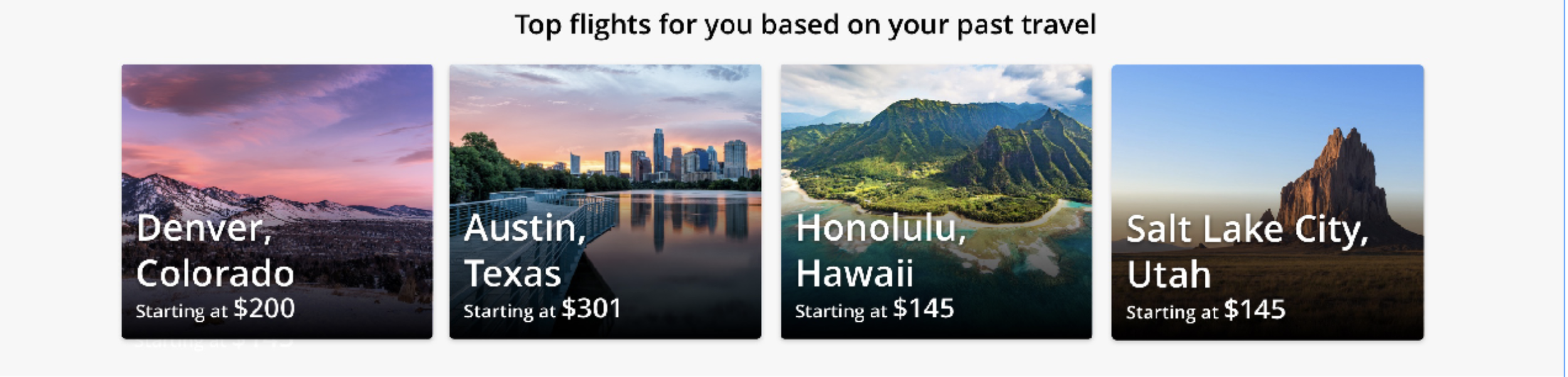 Before I began this project, United had previously done a test and learn with a feature to inspire travel by providing users with suggested destinations. However in this test, the destinations being generated were generic so every user was seeing the same destinations. The results didn’t show any significant improvement in conversions and so the project was put on hold for a while. After a couple of years, we were able to bring the project back but with the enhancement of utilizing our contextual engine to provide recommended destinations that were generated from the users past travel and shopping history.
